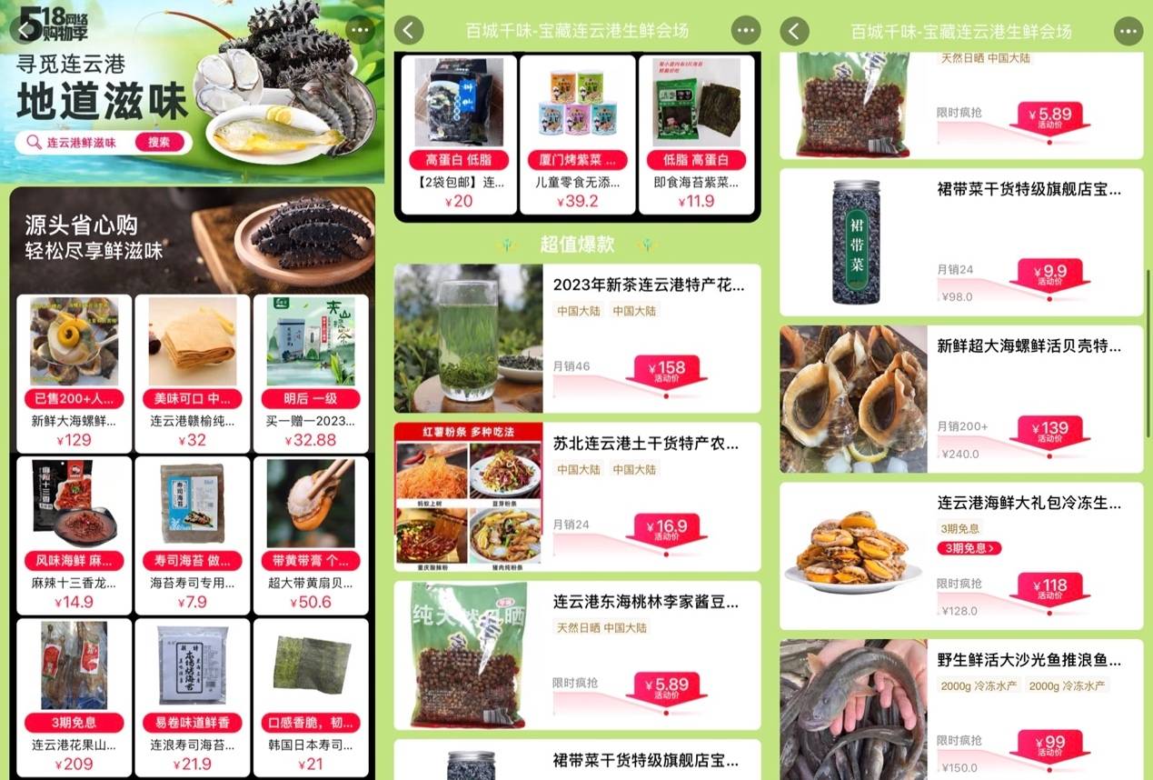 作为依托电商产业发展而打造的消费盛会,518网络购物季活动更是在线上舞台大展拳脚。本次消费季是连云港首次与头部平台展开紧密合作。活动整合天猫、淘宝等站内资源,上线百城千味-发现宝藏连云港专属会场,将赣榆海鲜、东海水晶等连云港好物进行一站式整合,同时还开启淘宝直播带货活动为连云港特色产品带货,为推广连云港特色名品解锁了全新通路。