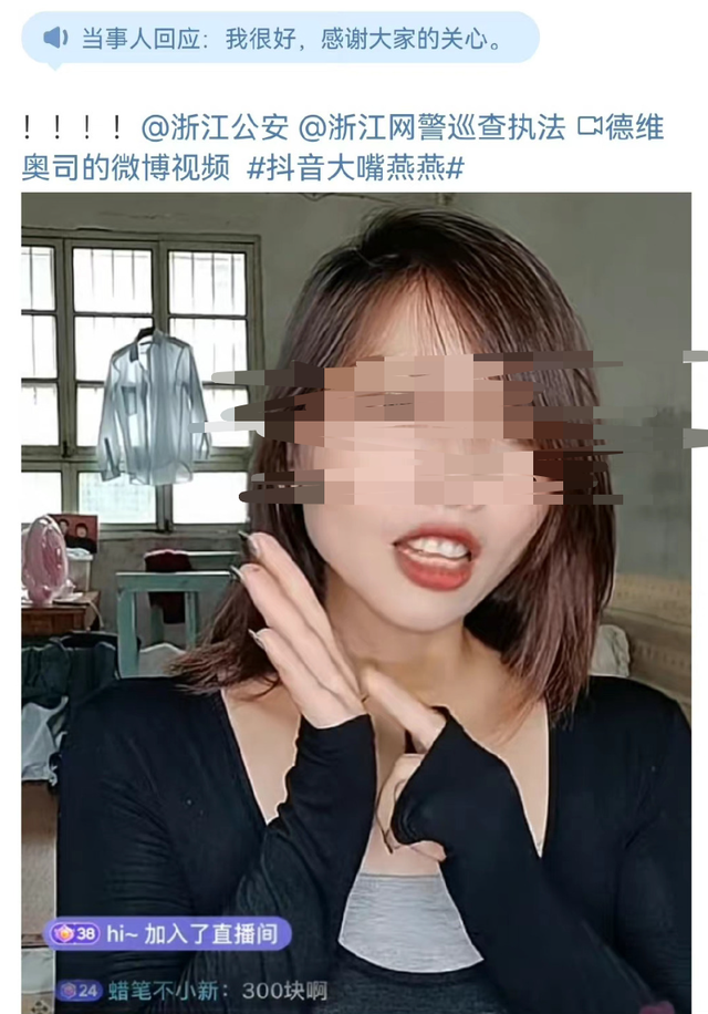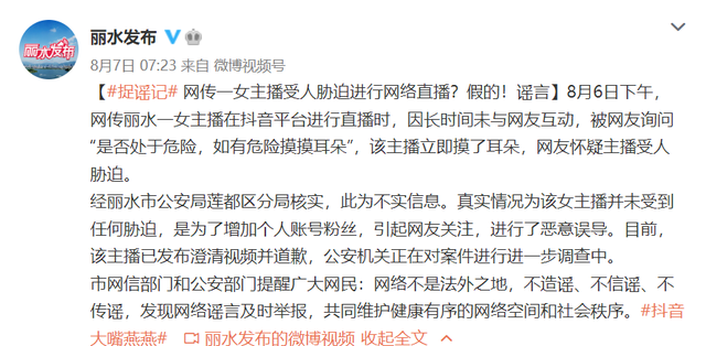 8月6日下午,网传丽水一女主播在抖音平台进行直播时,因长时间未与网友互动,被网友询问“是否处于危险,如有危险摸摸耳朵”,该主播立即摸了耳朵,网友怀疑主播受人胁迫。