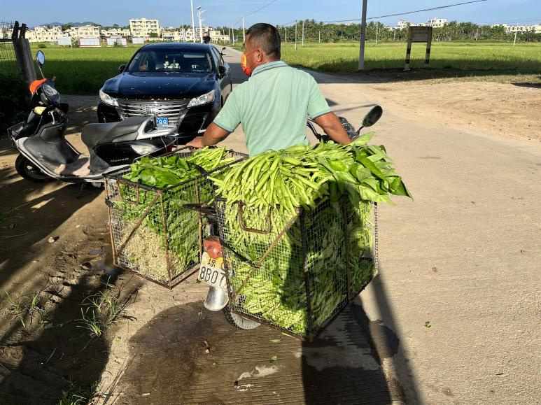 农户将空心菜运送至疫情防控服务点后再由物资运送组统一配送