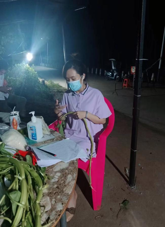 一盏照明灯,一部手机,一把空心菜,晚上10点,助农直播正在疫情防控值守点火热进行。“大家好,这里是龙滚镇文渊村,由于疫情影响我们农户空心菜卖不出去,希望大家多多帮忙,你们看我手上这棵嫩绿的空心菜新鲜又好吃,订购5斤我就给大家唱一首歌,赶紧下单尝一尝吧!”在直播现场,莫海婷玩起了花样唱歌,可谓是拿出了十八般武艺,尽心尽力助农带货,生动的讲解与直观的实物画面,让直播间的观众纷纷下单购买。